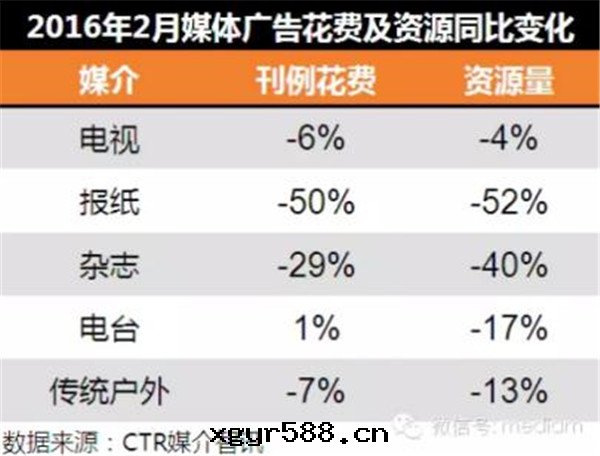 2016年(nián)2月(yuè),电視廣告花(huā)費同(tóng)比下(xià)降6%,资源量(liàng)同(tóng)比下(xià)降4%。各(gè)級頻道(dào)中(zhōng),除中(zhōng)央台(tái)廣告花(huā)費同(tóng)比呈現(xiàn)3%的增幅之(zhī)外,省(shěng)級衛視、省(shěng)級地(dì)面(miàn)台(tái)以(yǐ)及(jí)其(qí)他(tā)电視頻道(dào)廣告花(huā)費都呈現(xiàn)不(bù)同(tóng)程度(dù)的降幅。省(shěng)級衛視的同(tóng)比花(huā)費降幅达(dá)到(dào)9%,一(yī)改前(qián)幾(jǐ)个(gè)月(yuè)增长(cháng)趨勢。報紙(zhǐ)2月(yuè)廣告花(huā)費以(yǐ)及(jí)资源量(liàng)都跌破50%,形式更(gèng)加嚴峻。前(qián)五(wǔ)支柱行業中(zhōng),商業及(jí)服(fú)務(wù)性(xìng)行業、房地(dì)産/建築工程行業以(yǐ)及(jí)邮(yóu)电通(tòng)訊行業廣告投放(fàng)分(fēn)别下(xià)降56%、52%和(hé)63%。